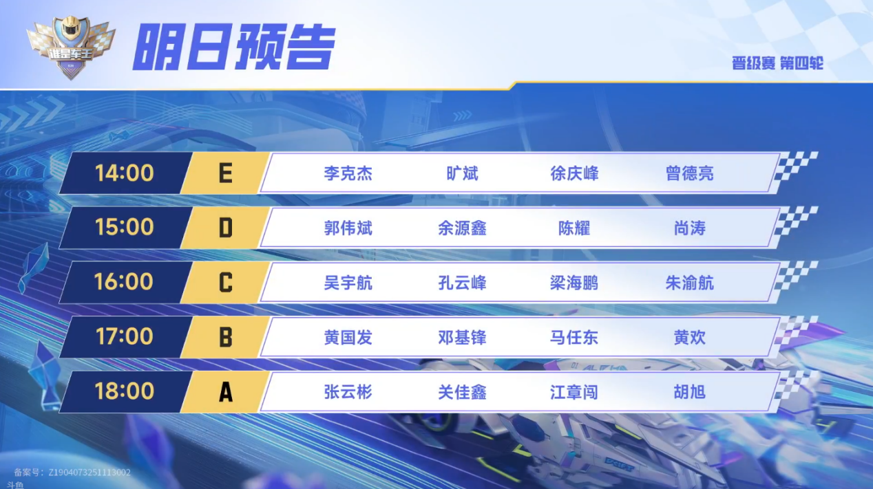 今日马任东使用“马氏起步”频频杀出,三局过后便以4:0:0:0的分数强势占据小组第一。郭伟斌在本组表现也是较为稳定,频频后追反超拿分。黄欢虽然对抗较少,但一直默默跟车,总能抓住他人失误的机会偷鸡得分。反观余源鑫在本组存在感较低,毫无晋级的机会。最终手握赛点的马任东终结C组比赛。