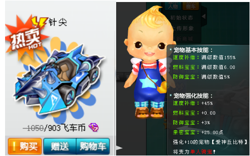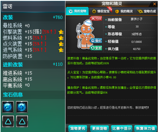 购买宠物姜饼小子,姜饼小子拥有160%的落后加成,在所有点券宠物中是最高的,65%的撞击保护、点火+6加成,并开放强化,轻松碾压其他点券宠物。为何选择姜饼小子而非羊驼呢?因为羊驼提供引擎+6加成,而当赛车的引擎出[强]标识后,宠物的引擎加成也基本无效果。